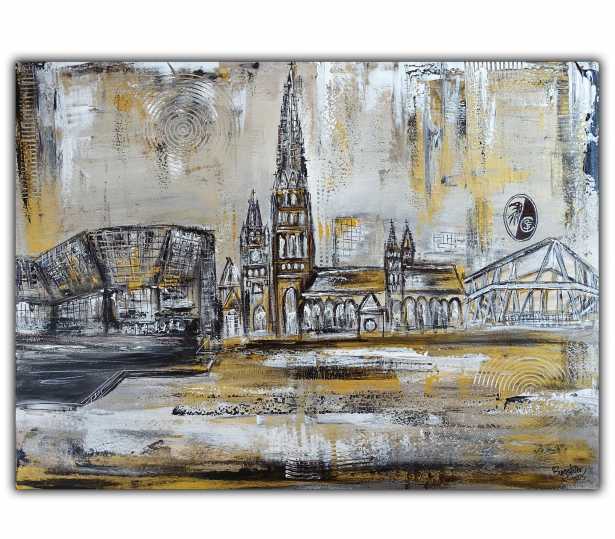 Freiburg Skyline, abstrakt gemaltes Leinwandbild, gold und silber. 80x60cm.
