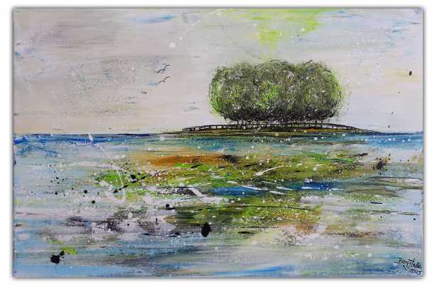 Insel 2 - abstraktes Gemälde, Landschaft, See, Baum, moderne Malerei. 60x90cm.