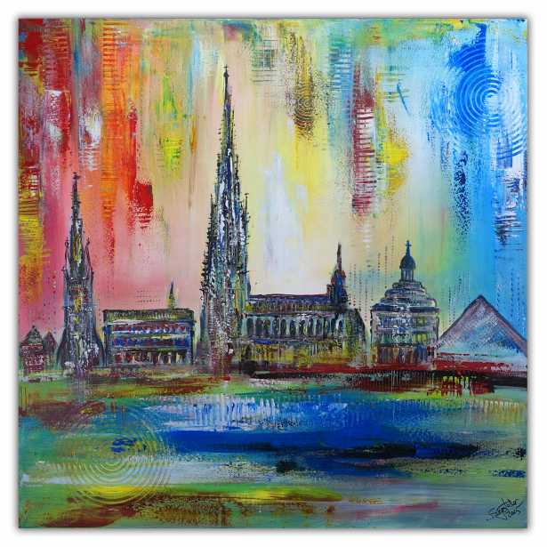 Ulm - Bild, abstraktes Skyline Gemälde, Ulmer Münster, Rathaus, Bücherei. 100x100cm.