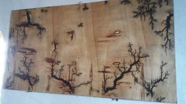 nach dem Lichtenberg Verfahren gefertigte Unikate auf Holz ,mit Hochspannung in Holz gebrannte Bilder... hier malt die Energie selber